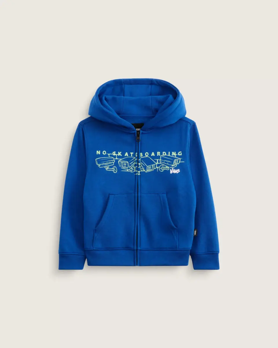 La felpa con cappuccio e zip Little Kids Night Watchers è una classica felpa con cappuccio e tasche anteriori, realizzata in pile spazzolato per maggiore calore e comfort. Presenta inoltre dettagli a coste con una grafica serigrafata di telecamere di sicurezza sempre attive sopra il logo Vans® sul davanti.
