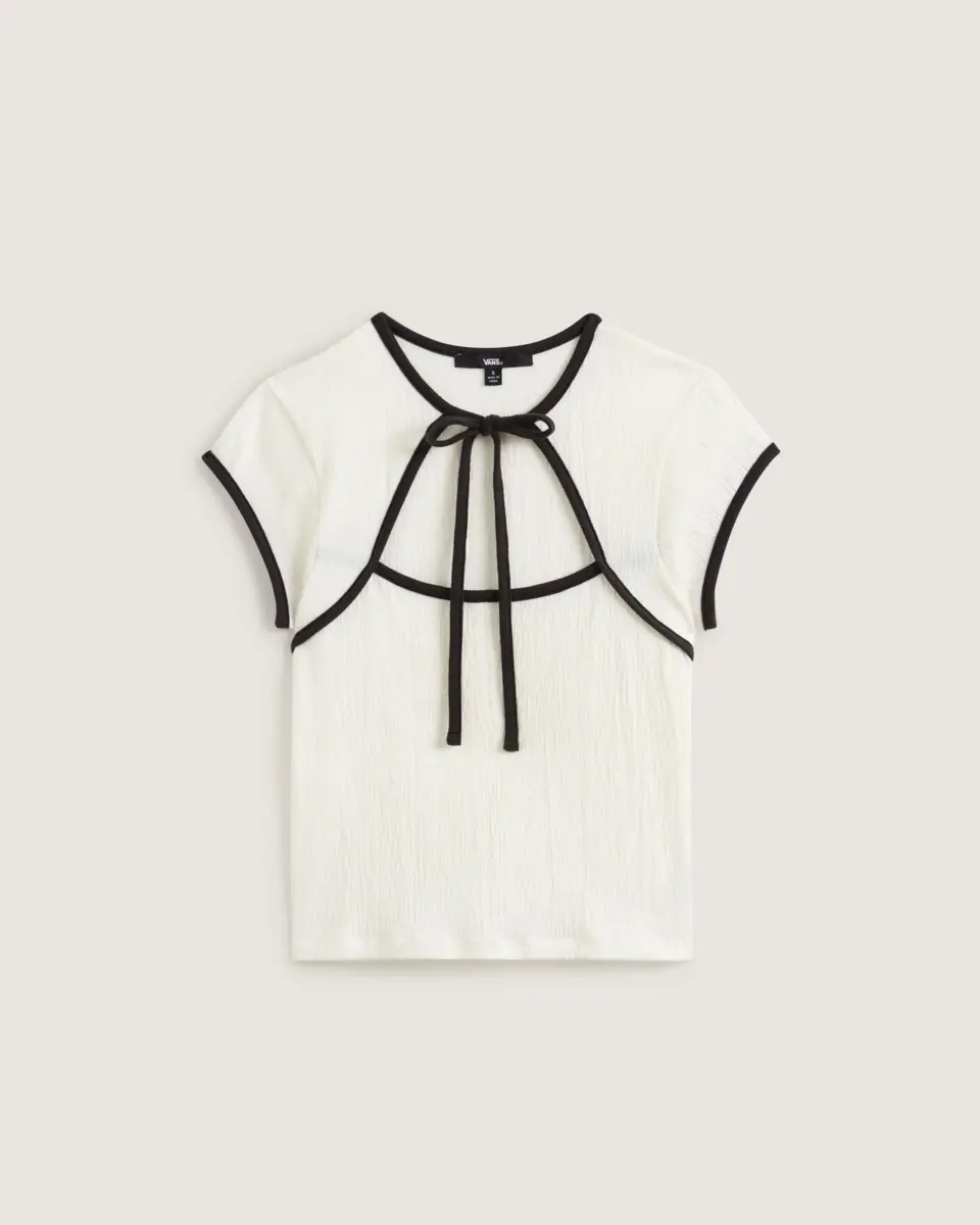 Dettagli a contrasto e un delicato colletto con laccetto trasformano questa T-shirt dalla sala riunioni alla strada.
