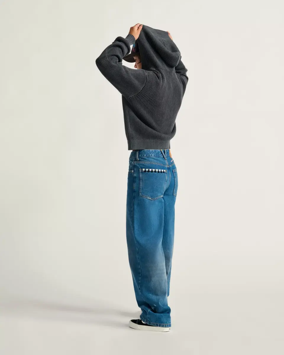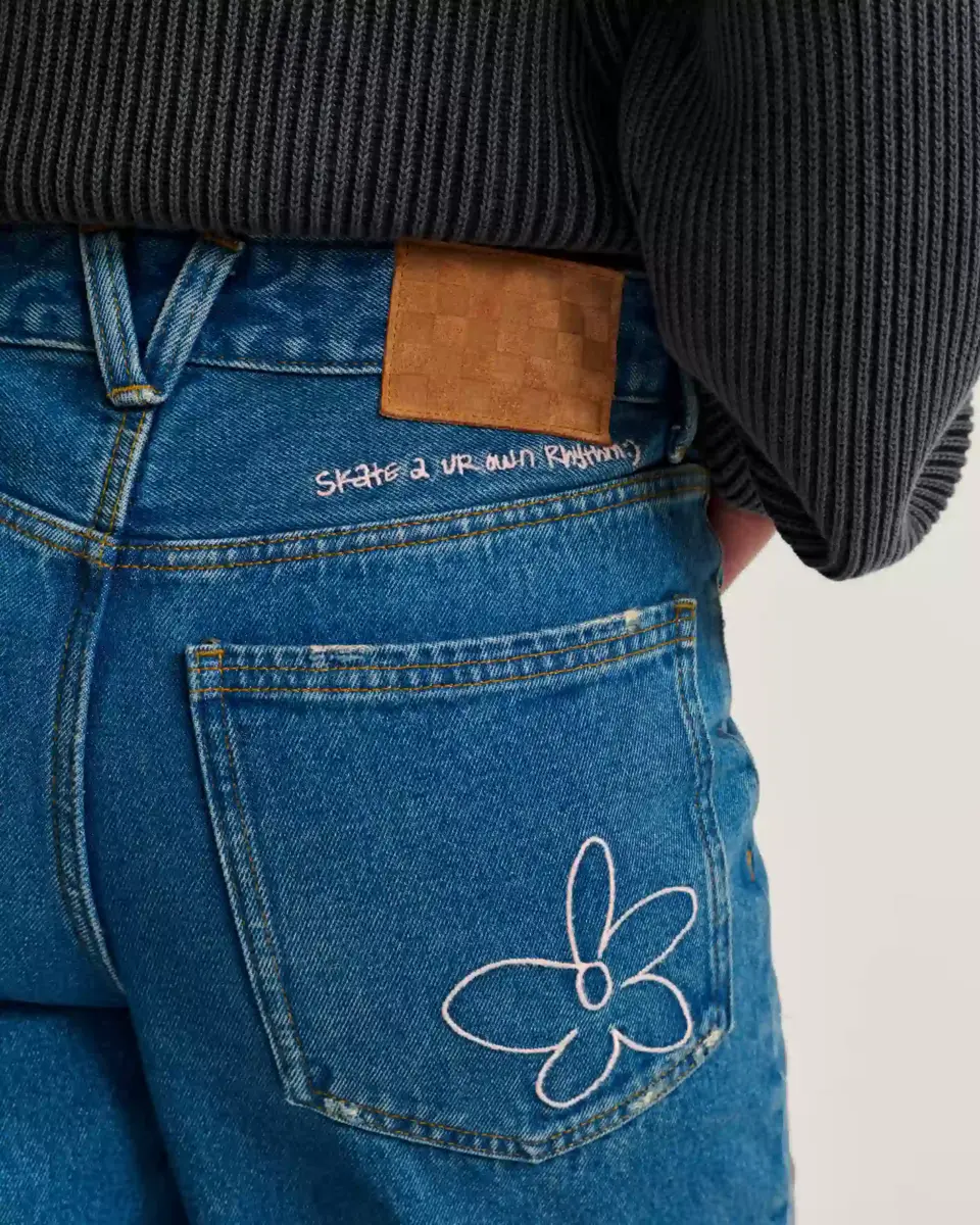 I pantaloni in denim ricamati Sirelle sono un omaggio al passato con un tocco di nostalgia per lo skate. Realizzati in denim pesante da 14 once con un lavaggio leggermente sbiadito per un look vissuto, questi pantaloni larghi a vita media raggiungono la lunghezza di una pozzanghera per un look perfettamente imperfetto. Dettagli ricamati e dettagli a scacchiera aggiungono un tocco di carattere discreto.