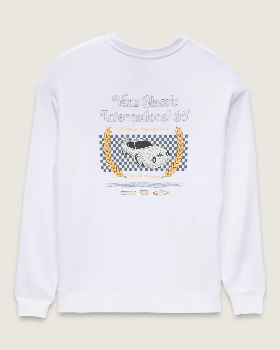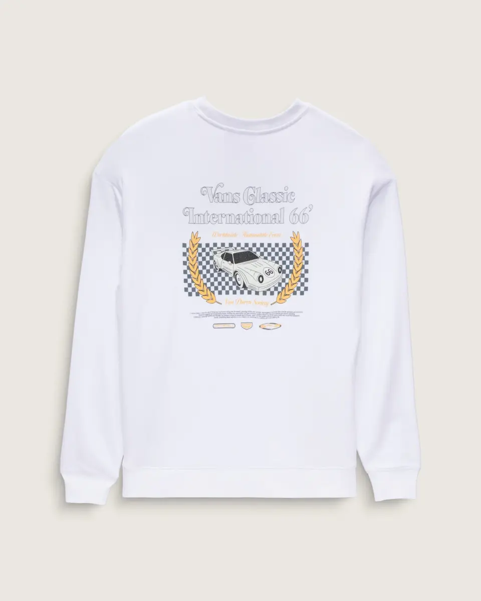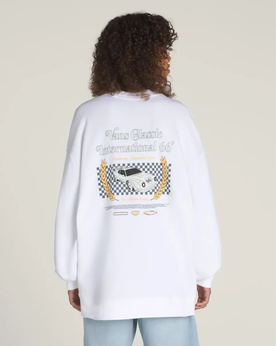 La felpa oversize Sport International 66 è una comoda felpa a maniche lunghe in misto cotone con stampa serigrafica di uno stemma Vans® sul davanti e una grafica più grande del programma automobilistico immaginario a cui è collegata sul retro.