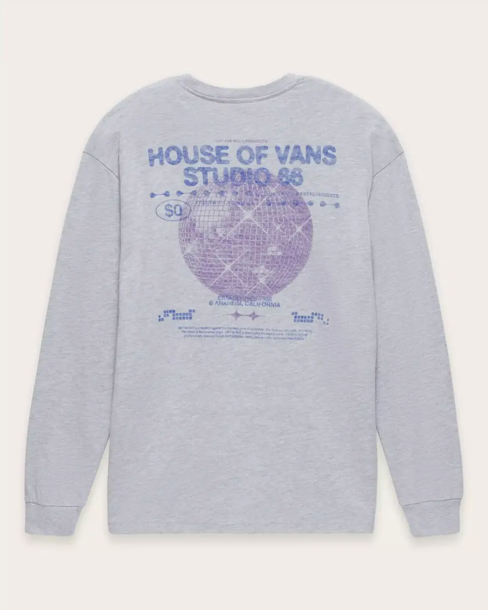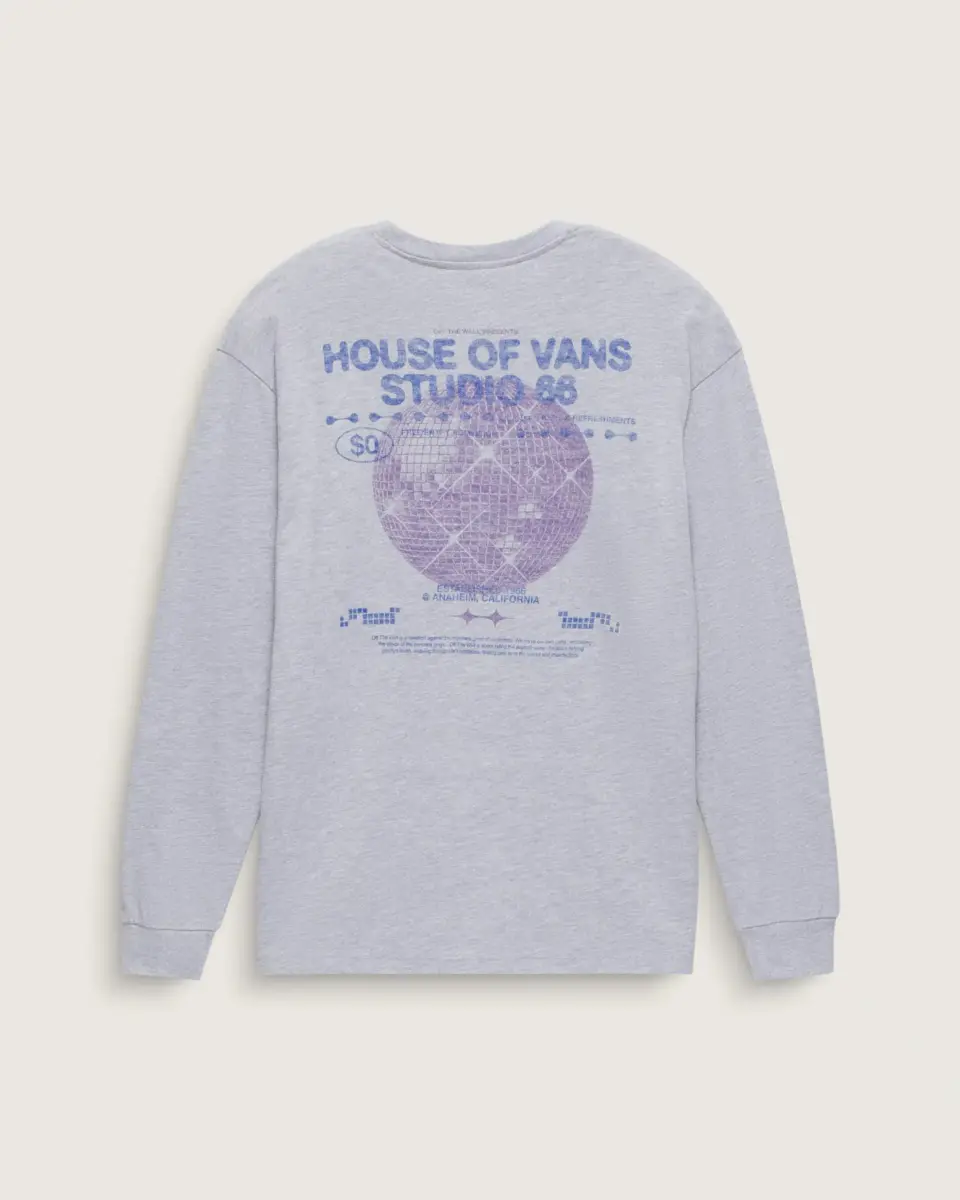 La t-shirt a maniche lunghe Disco Nights è una classica t-shirt girocollo, realizzata in cotone leggero con dettagli grafici a forma di palla da discoteca sul retro e scritte stravaganti sul petto.