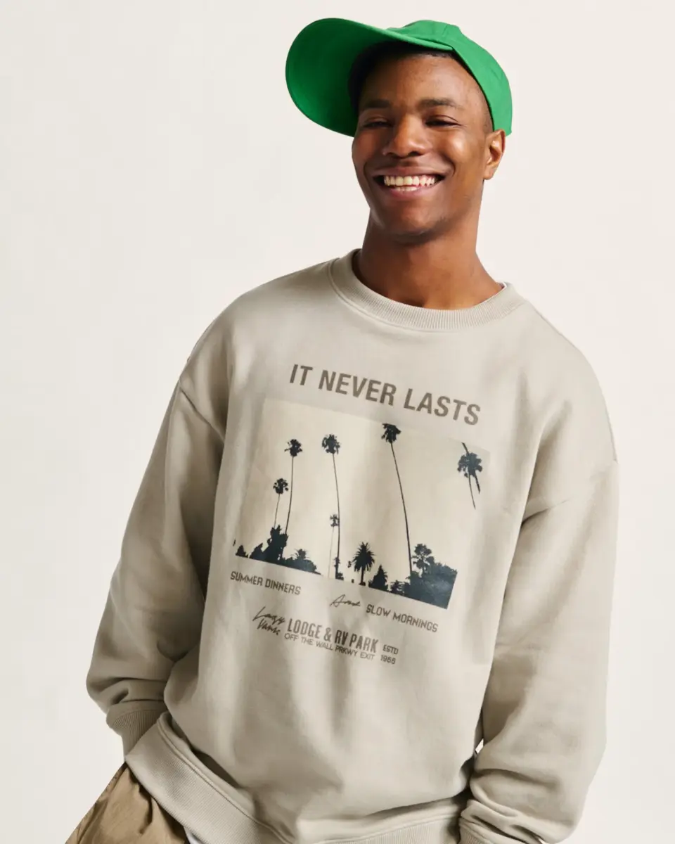 Realizzata in morbido e resistente pile misto cotone, la felpa oversize Photo Neverlasting è una felpa girocollo a maniche lunghe con grafica di palme fotografate e marchio Vans® aggiuntivo sul davanti.