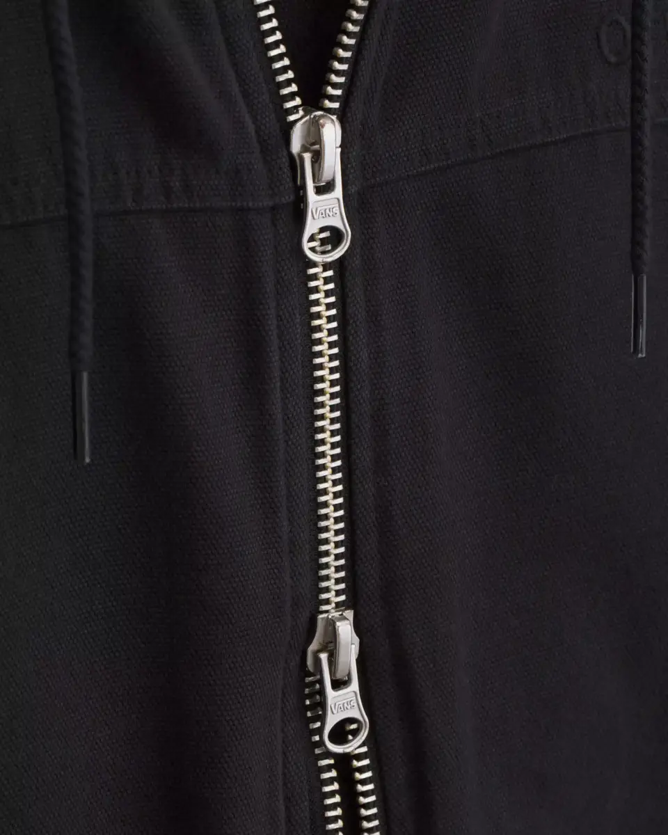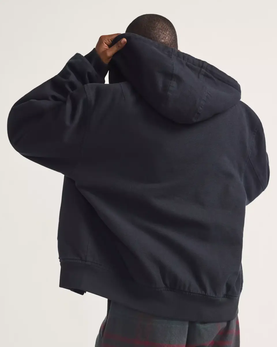 Una giacca da lavoro con cappuccio in robusta tela di anatra, bilanciata da dettagli essenziali.