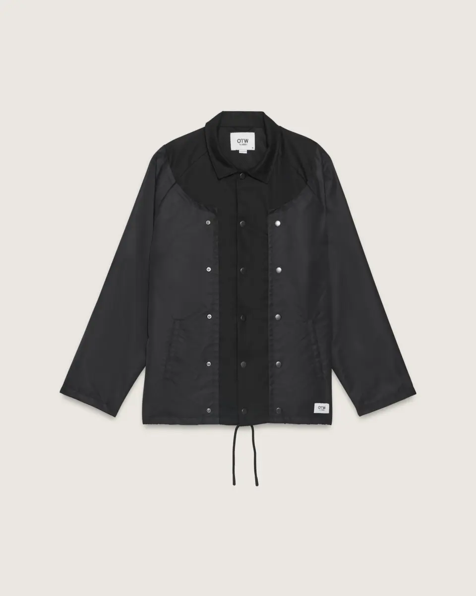 Giacca in stile coach con esterno in raso da aviatore, fodera in rete e rivestimento in twill, chiusura frontale con bottoni decorativi sulla sovrapposizione, tasche a fessura sui fianchi, coulisse sull’orlo per una vestibilità personalizzabile, etichetta interna tessuta OTW® e etichetta esterna da lavoro sull’orlo inferiore sinistro anteriore della giacca.