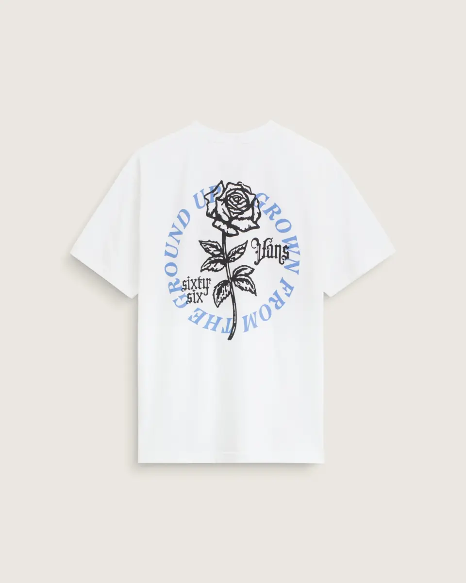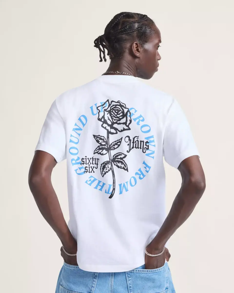 Sboccia con la t-shirt Grown From The Ground Up, una maglietta girocollo dal look classico. La stampa serigrafica presenta un logo Vans con scritta di lunga durata su una rosa sul davanti, mentre le maniche corte donano uno stile casual e quotidiano.