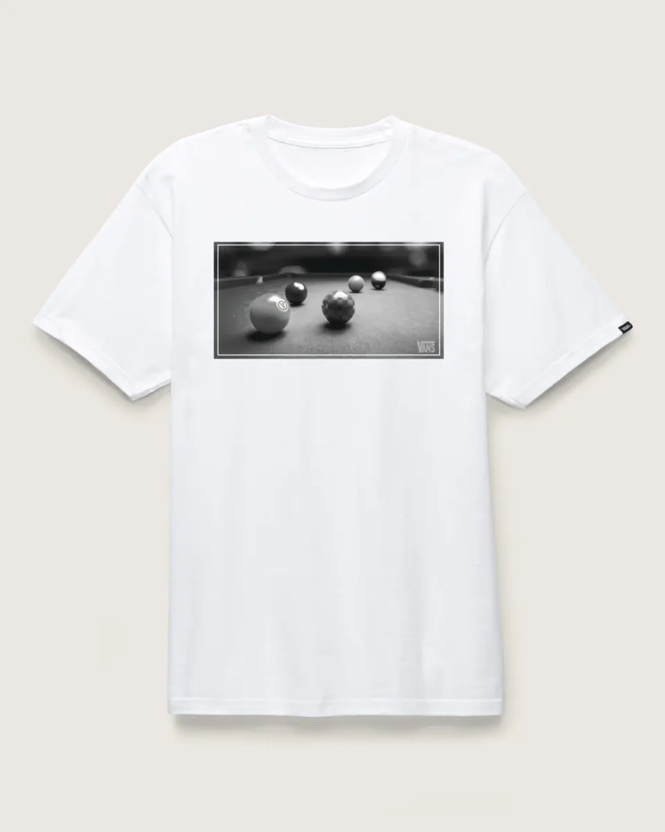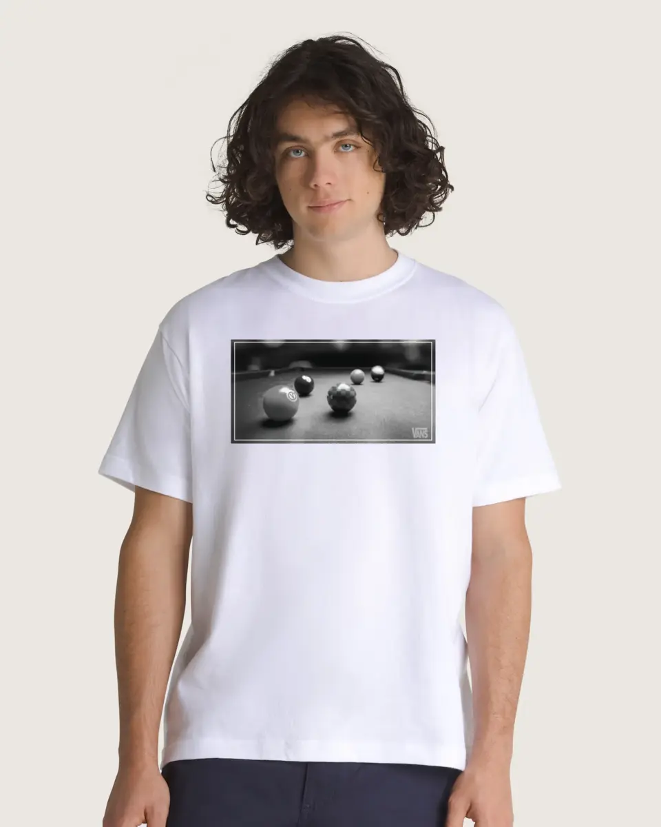 La Pocket T-Shirt è una maglietta girocollo a maniche corte realizzata in cotone pesante con una grafica serigrafata di un set da biliardo.