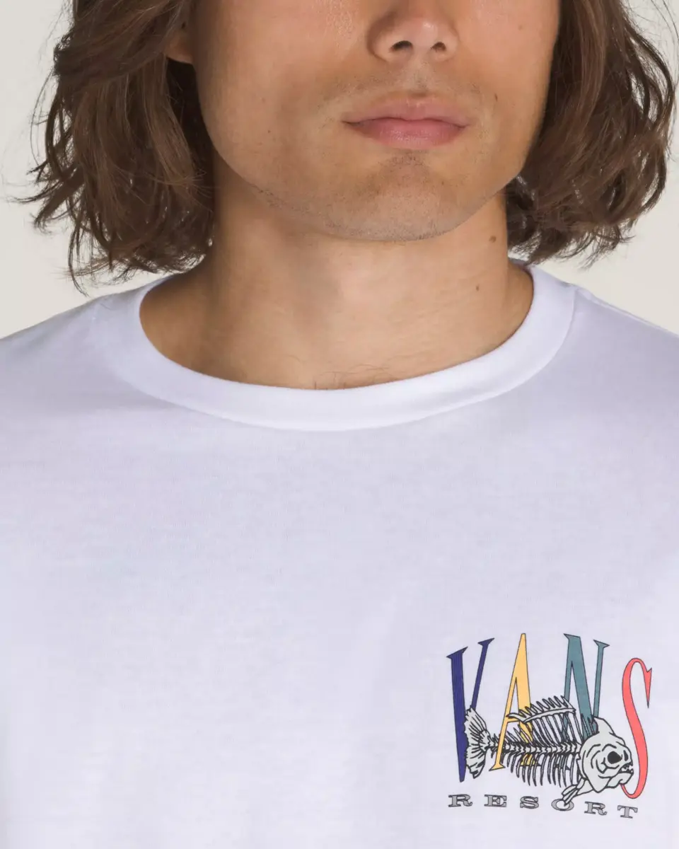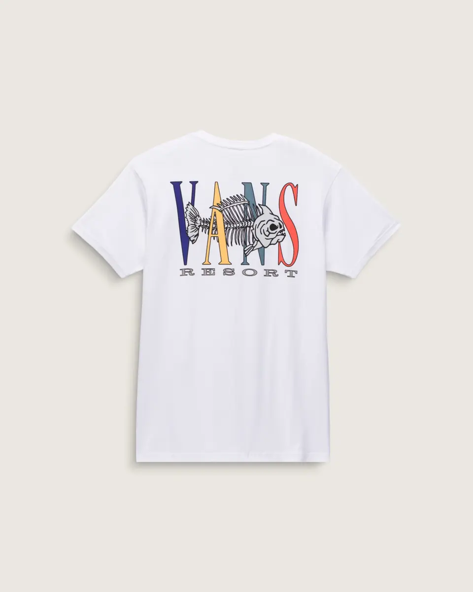 La Vans Resort T-Shirt è una maglietta girocollo a maniche corte dalla vestibilità classica con una grafica serigrafata del logo Vans® sul petto a sinistra e uno scheletro di pesce intrecciato con Vans sul retro.