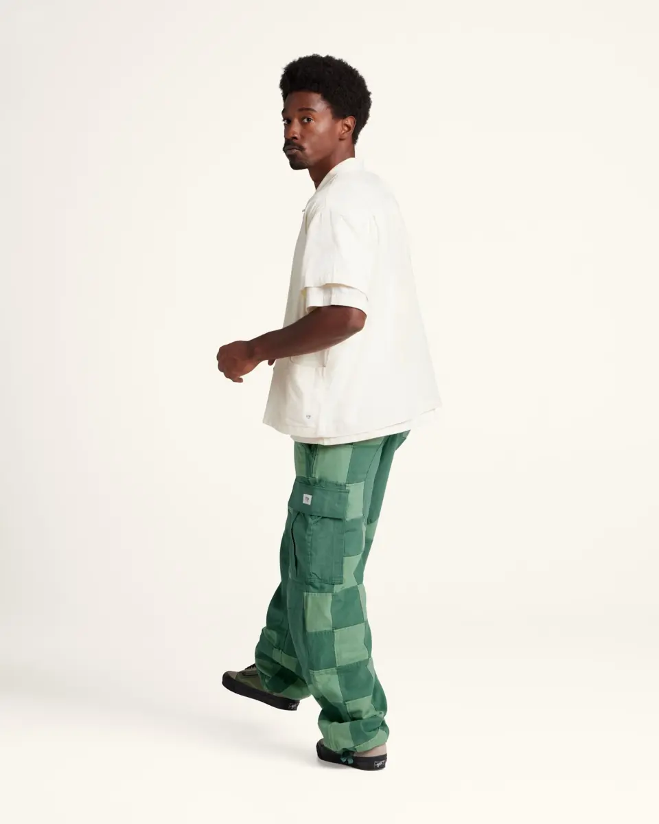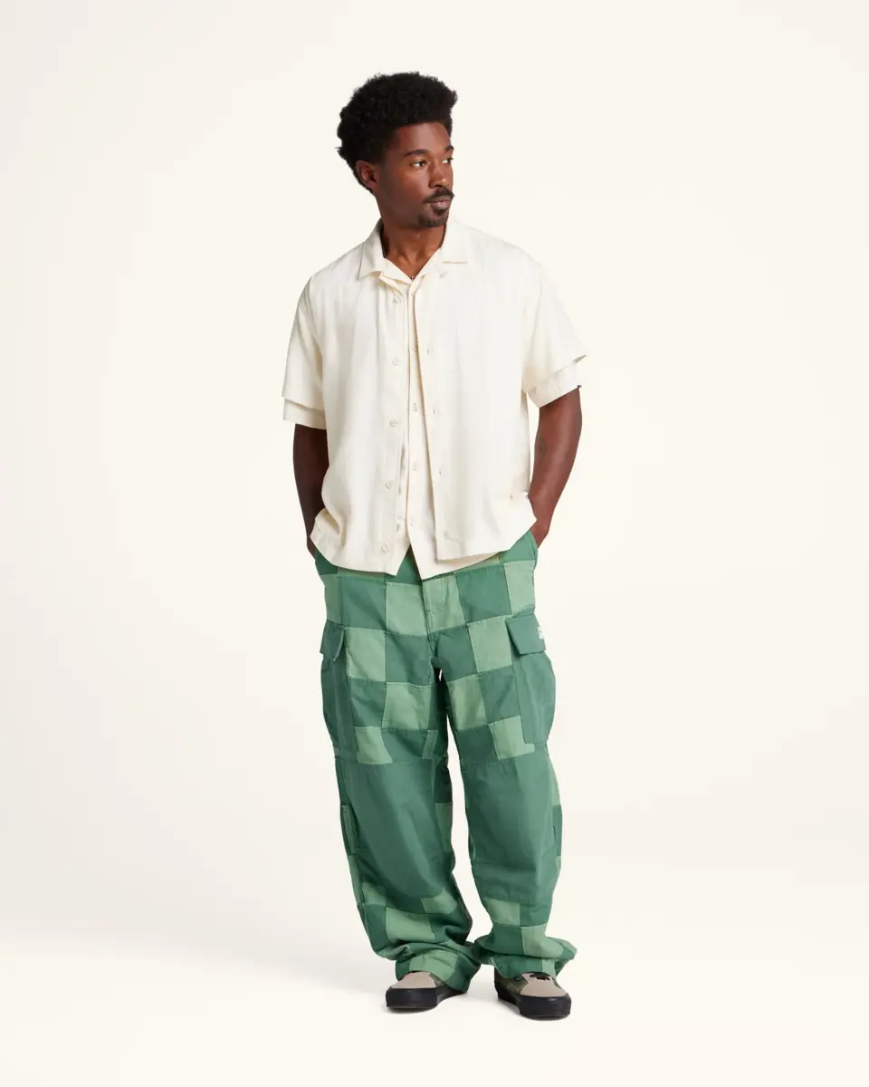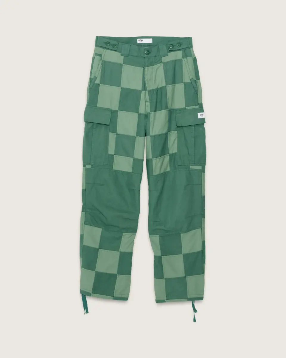 Pantaloni cargo oversize con tessuto patchwork bicolore, tasche solide, tessuto per ginocchia e sella, coulisse di regolazione sull’orlo inferiore, etichetta OTW® interna ed etichetta OTW® per abbigliamento da lavoro e bandiera esterna.