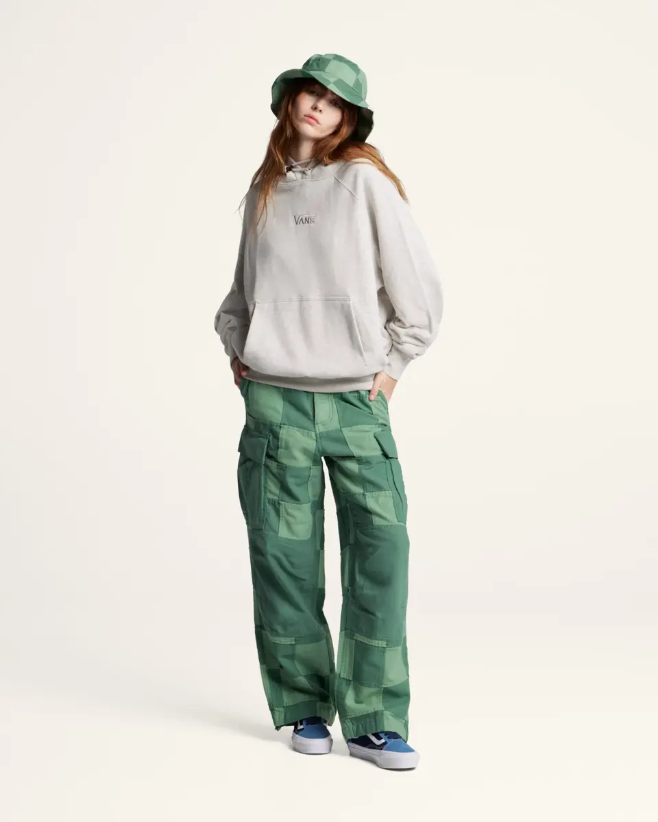 Pantaloni cargo oversize con patchwork bicolore e orlo regolabile.