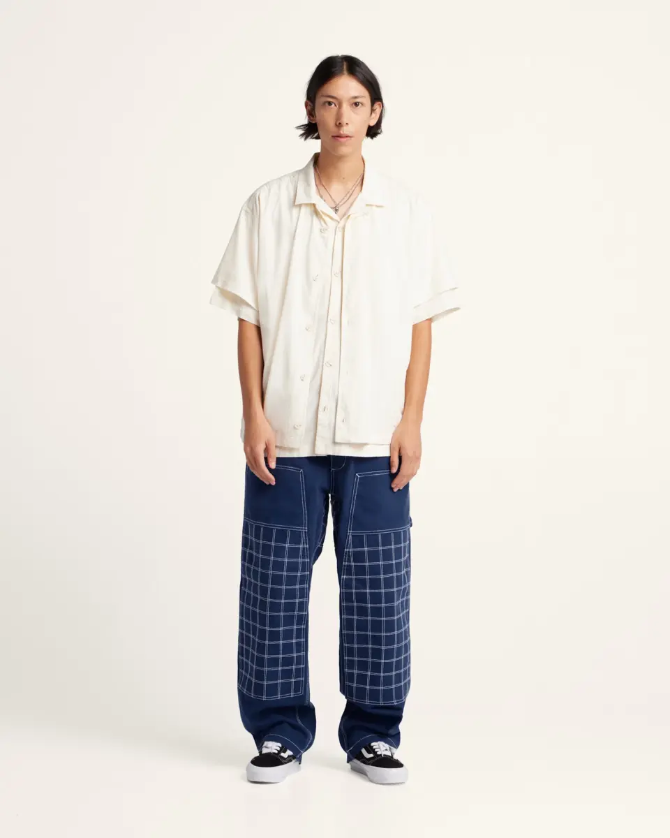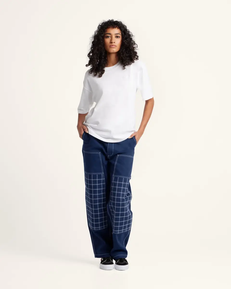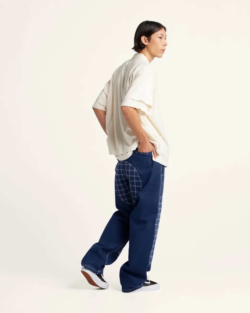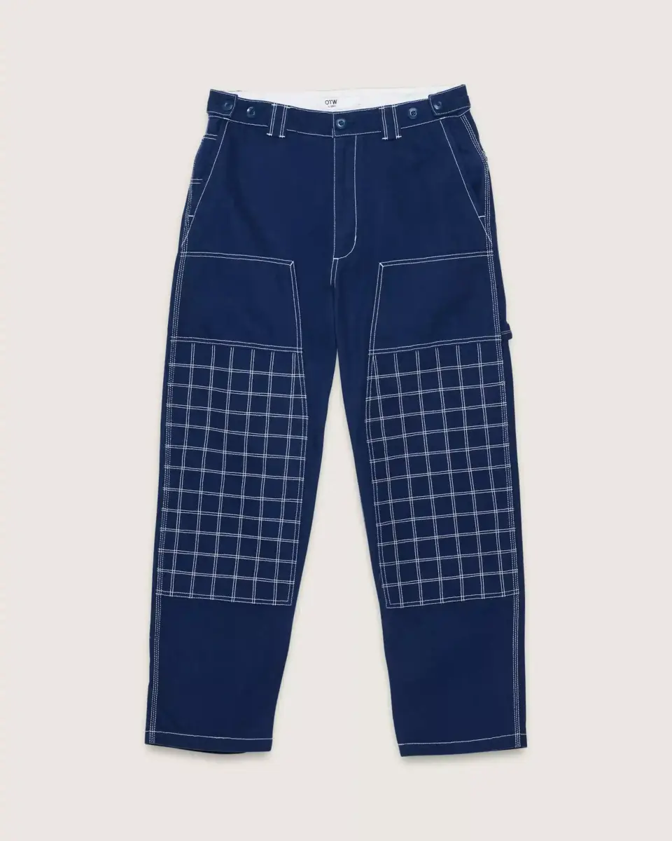 Pantaloni da carpentiere dalla vestibilità oversize con pannelli trapuntati, tasche posteriori a doppia entrata con cerniera completa, linguetta con bottone in vita per una vestibilità regolabile, passante per martello e tasca applicata sulla cucitura esterna con cuciture a contrasto, etichetta interna tessuta OTW® ed etichette esterne con bandiera e abbigliamento da lavoro