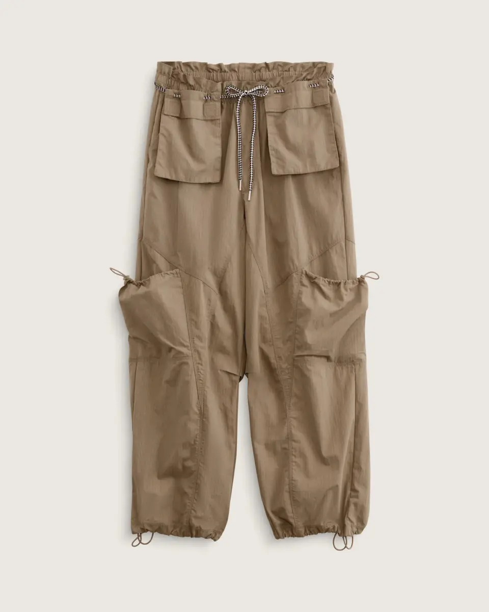 Realizzati in ripstop traspirante, questi pantaloni uniscono praticità e libertà di stile: tasche oversize, vita regolabile con elastico e orli con alamari per indossarli larghi o affusolati.